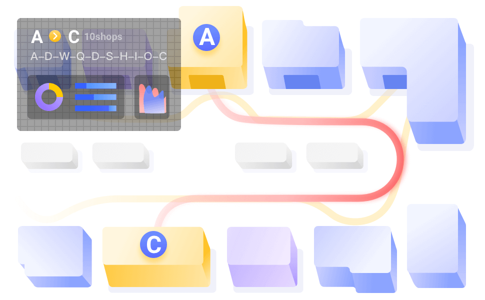 通过消费者行为路径可分析,消费者从A点—C点中间经过了多少个店铺才产生了购买行为,以及下次入店的可能性